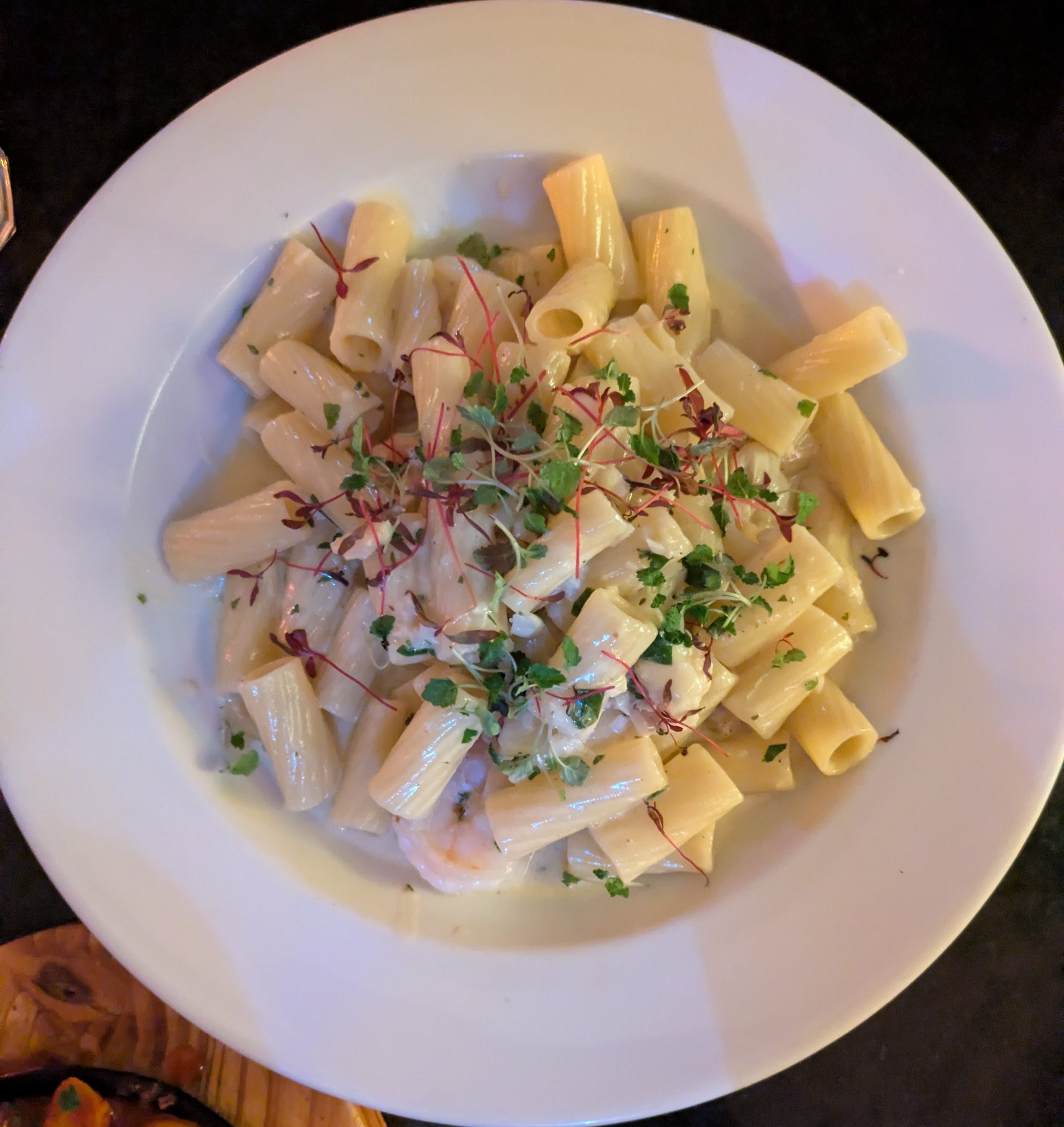The star of the show however, has to be the Eglefino con Rigatoni (Haddock and Tiger Prawns with Rigatoni in a cream sauce). A rich well seasoned sauce that balances against the lighter fishes of haddock and prawns. With a beautiful herb garnish to finish.
