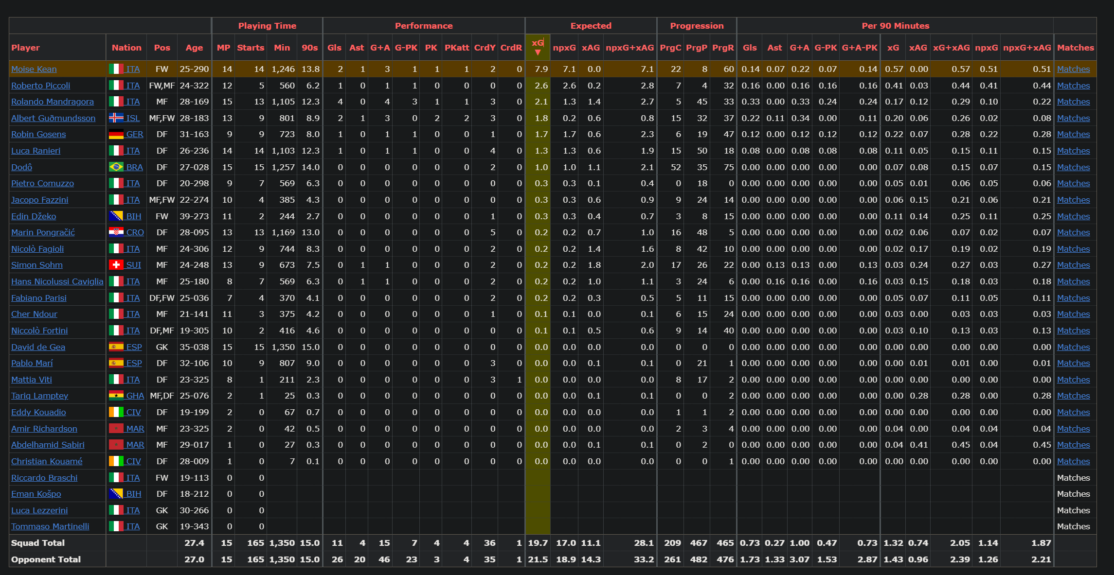 Moise Kean finished with 19 league goals last season from an xG of 21, 13 goals clear of their second highest scorer Albert Gudmundsson. But this season, in 14 starts he’s only netted twice for the club from an xG of 8. Gudmundsson has the same return (2) in 13 appearances (9 starts) from an xG of 1. It’s clear from this that Moise Kean has experienced a huge drop-off in output last season, but it’s not down to not getting the same chances, he simply isn’t taking them. As is reflected in his xG underperformance.